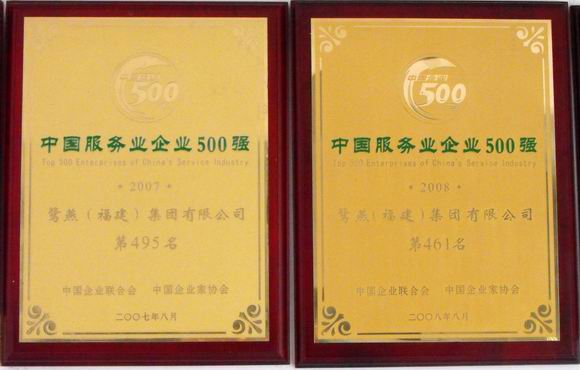 鷺燕集團又傳捷報,在榮獲了“市百強企業”、“市重點民營企業”、“湖里區十佳文明企業”之后,再次榮獲“中國服務企業500強”稱號,這已是鷺燕集團連續三年獲此殊榮。