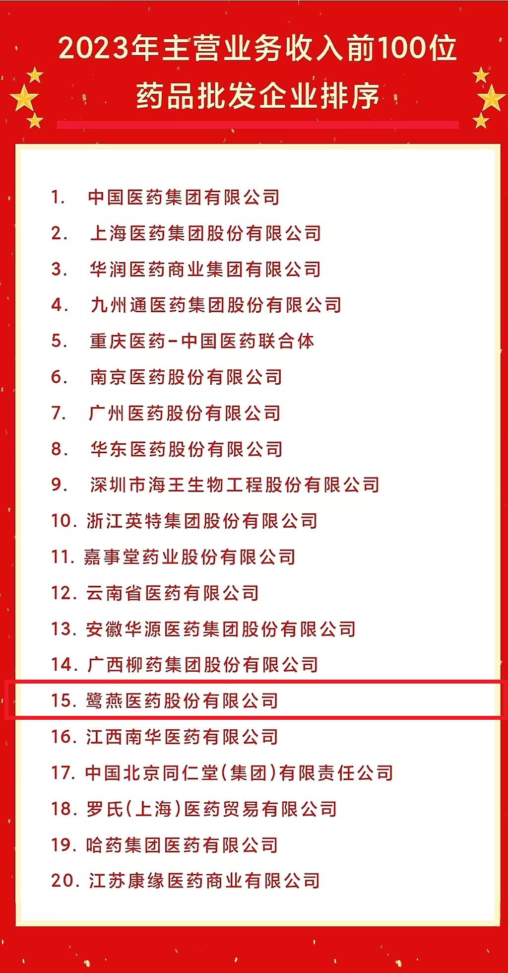 鷺燕醫藥榮登2023年藥品批發企業主營業務收入第15位!